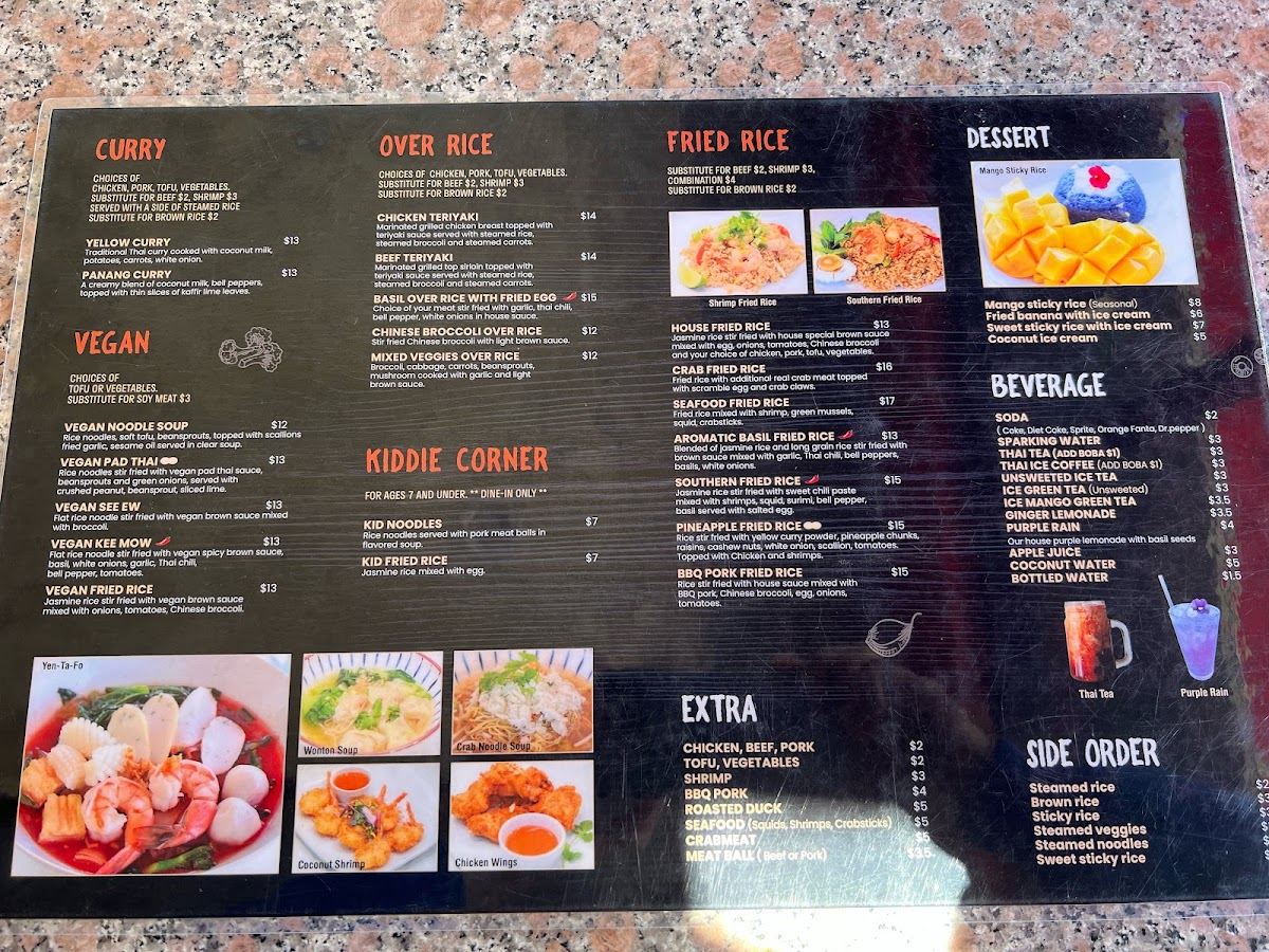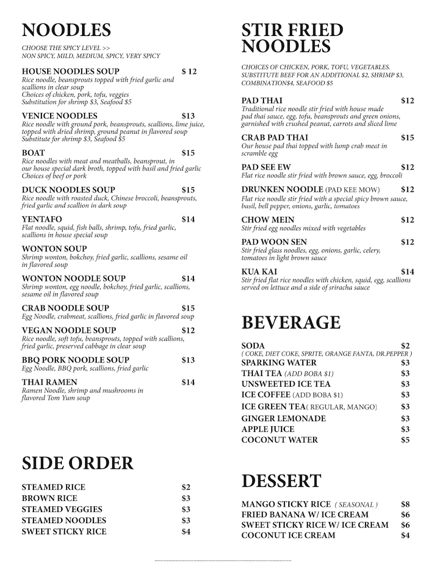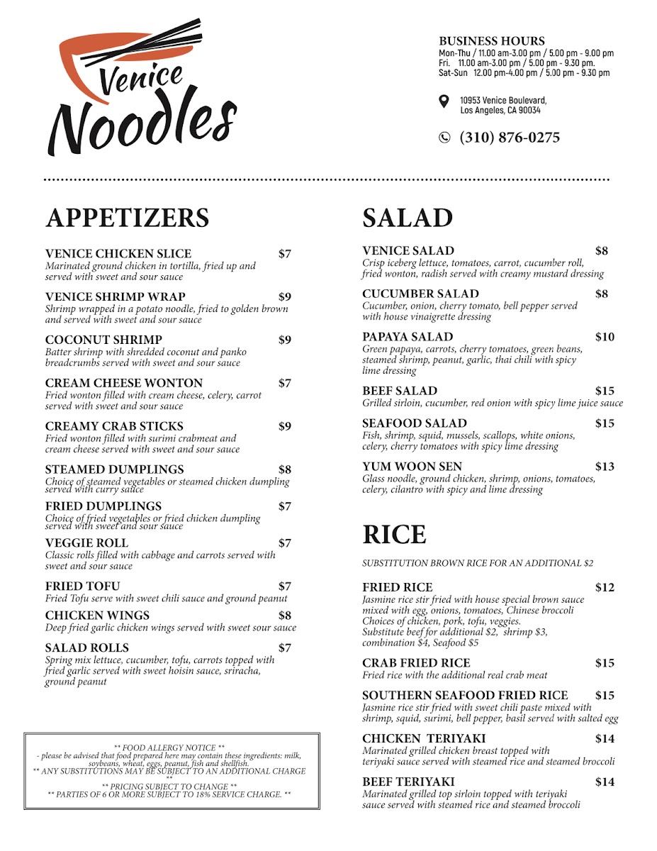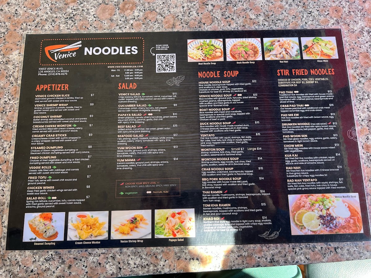 Venice Noodles at 10953 Venice Blvd. offers a menu that is both extensive and inviting, showcasing a wide array of traditional and modern Asian dishes. For noodle lovers, options like WONTON NOODLE SOUP, DUCK NOODLE, BOAT NOODLE KHAO SOI, and VENICE NOODLE provide comforting bowls of rich flavors. Appetizers such as STEAMED DUMPLINGS, VEGGIE ROLLS, CREAMY CRAB STICKS, FRIED TOFU, and the VENICE SHRIMP WRAP make for perfect starters. Those seeking a heartier meal can explore the “Over Rice” section with dishes like CHINESE BROCCOLI, CHICKEN TERIYAKI, TOFU TERIYAKI, BEEF TERIYAKI, and BASIL WITH FRIED EGG, while stir-fried noodle options include PAD WOON SEN, CHOW MEIN, KUA KAI PAD SEE EW, and RAD NAH. Vegan diners are well-catered to with TOFU TERIYAKI, VEGAN NOODLE SOUP, VEGAN FRIED RICE, VEGAN SEE EW, and VEGAN KEE MOW. For lighter choices, the salad offerings like CUCUMBER SALAD, VENICE SALAD, PAPAYA SALAD, SEAFOOD SALAD, and YUM MAMA are refreshing. Desserts such as SWEET STICKY RICE WITH COCONUT ICE-CREAM, COCONUT ICE-CREAM, MANGO STICKY RICE, and FRIED BANANA WITH ICE-CREAM round out the meal beautifully. The menu also features diverse rice dishes, including AROMATIC BASIL FRIED RICE, CRAB FRIED RICE, SOUTHERN SEAFOOD FRIED RICE, and BBQ PORK FRIED RICE, along with curry selections like YELLOW CURRY and PANANG CURRY. Drinks like APPLE JUICE, COCONUT WATER, ICED MANGO GREEN TEA, PURPLE RAIN, and UNSWEETENED ICED TEA complement the food. With thoughtful options for sides such as STICKY RICE, FRIED EGG, STEAMED NOODLES, and BROWN RICE, Venice Noodles provides a menu that satisfies every craving while remaining approachable and flavorful.