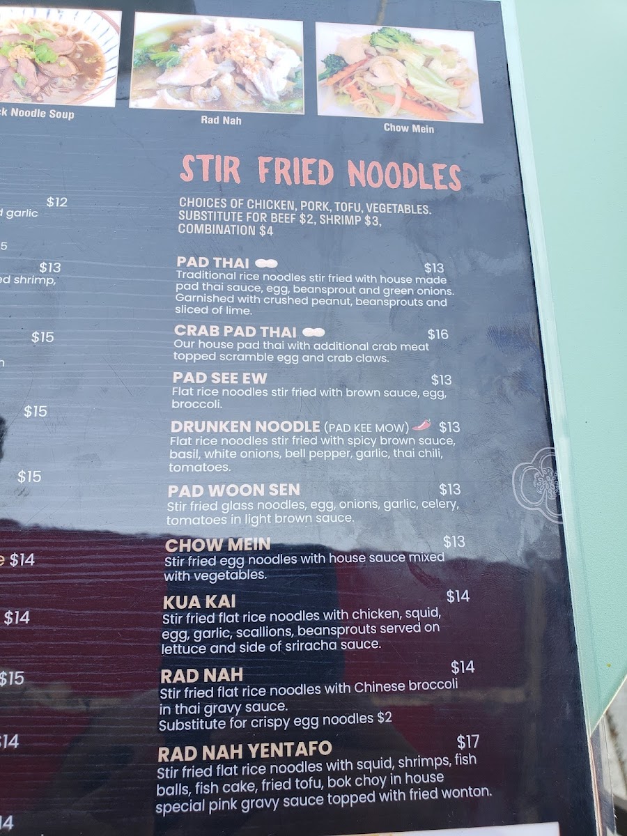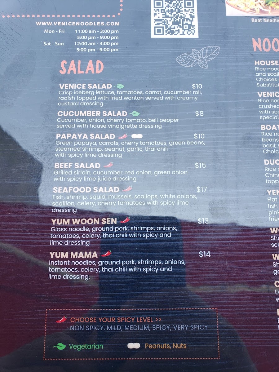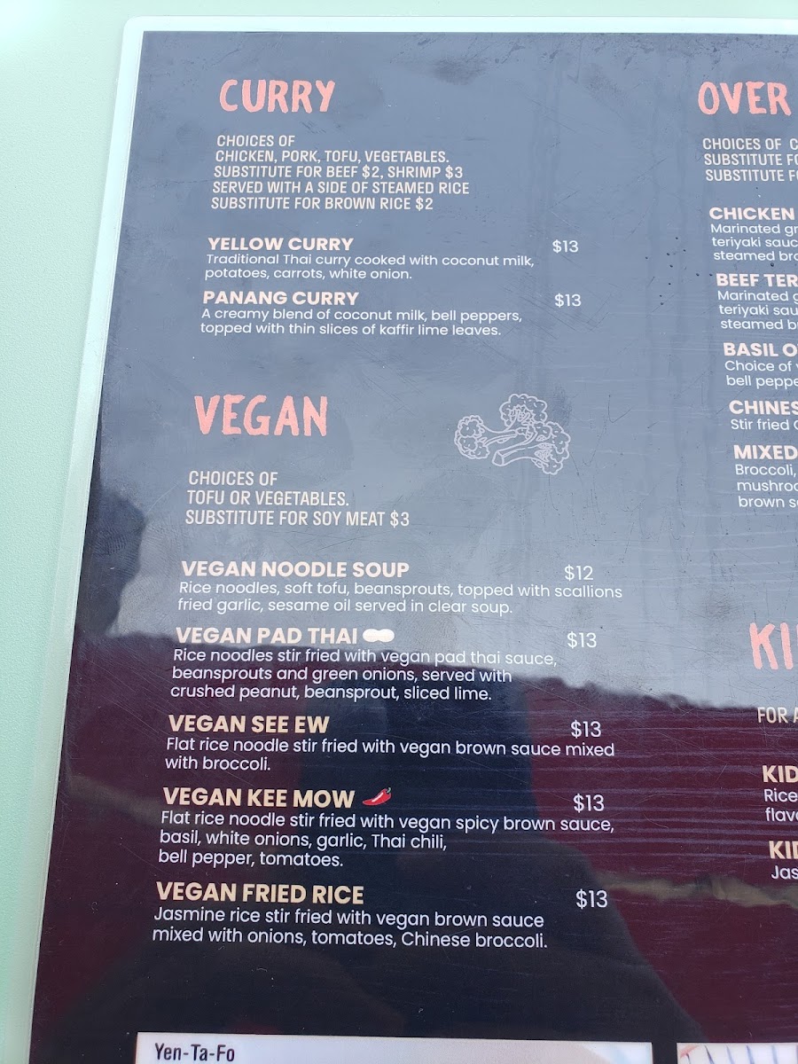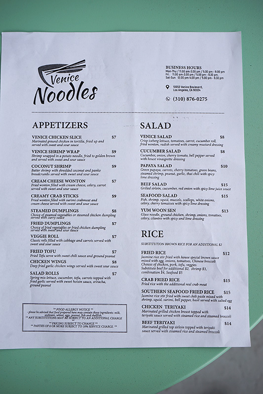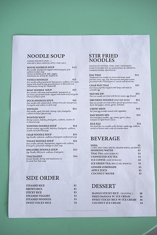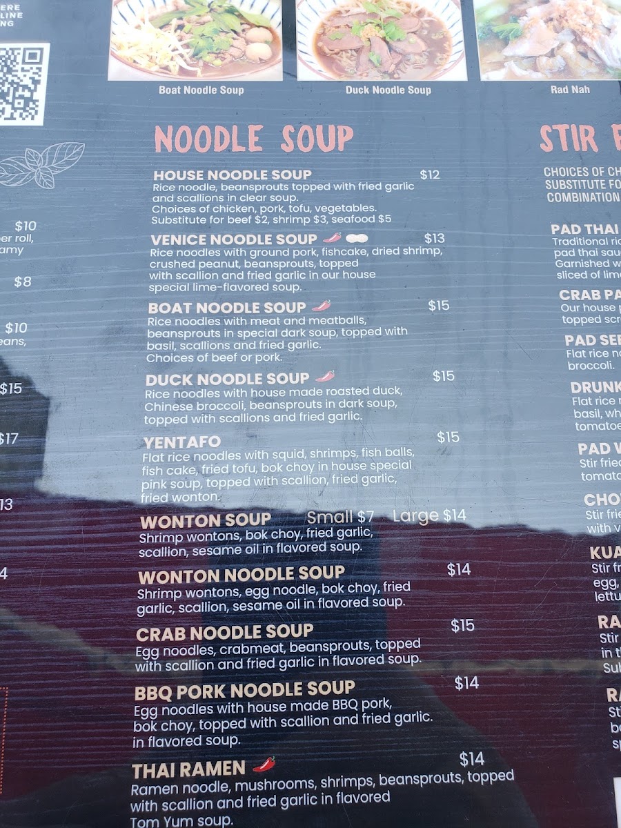 Venice Noodles at 10953 Venice Blvd. offers a menu that is both extensive and inviting, showcasing a wide array of traditional and modern Asian dishes. For noodle lovers, options like WONTON NOODLE SOUP, DUCK NOODLE, BOAT NOODLE KHAO SOI, and VENICE NOODLE provide comforting bowls of rich flavors. Appetizers such as STEAMED DUMPLINGS, VEGGIE ROLLS, CREAMY CRAB STICKS, FRIED TOFU, and the VENICE SHRIMP WRAP make for perfect starters. Those seeking a heartier meal can explore the “Over Rice” section with dishes like CHINESE BROCCOLI, CHICKEN TERIYAKI, TOFU TERIYAKI, BEEF TERIYAKI, and BASIL WITH FRIED EGG, while stir-fried noodle options include PAD WOON SEN, CHOW MEIN, KUA KAI PAD SEE EW, and RAD NAH. Vegan diners are well-catered to with TOFU TERIYAKI, VEGAN NOODLE SOUP, VEGAN FRIED RICE, VEGAN SEE EW, and VEGAN KEE MOW. For lighter choices, the salad offerings like CUCUMBER SALAD, VENICE SALAD, PAPAYA SALAD, SEAFOOD SALAD, and YUM MAMA are refreshing. Desserts such as SWEET STICKY RICE WITH COCONUT ICE-CREAM, COCONUT ICE-CREAM, MANGO STICKY RICE, and FRIED BANANA WITH ICE-CREAM round out the meal beautifully. The menu also features diverse rice dishes, including AROMATIC BASIL FRIED RICE, CRAB FRIED RICE, SOUTHERN SEAFOOD FRIED RICE, and BBQ PORK FRIED RICE, along with curry selections like YELLOW CURRY and PANANG CURRY. Drinks like APPLE JUICE, COCONUT WATER, ICED MANGO GREEN TEA, PURPLE RAIN, and UNSWEETENED ICED TEA complement the food. With thoughtful options for sides such as STICKY RICE, FRIED EGG, STEAMED NOODLES, and BROWN RICE, Venice Noodles provides a menu that satisfies every craving while remaining approachable and flavorful.